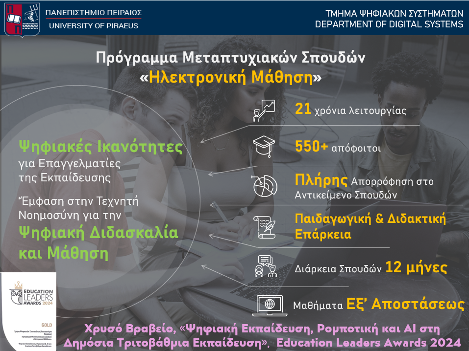 Το Πρόγραμμα Μεταπτυχιακών Σπουδών στην Ηλεκτρονική Μάθηση (ΠΜΣ-ΗΜ) του Τμήματος Ψηφιακών Συστημάτων καλύπτει αυτή την ανάγκη και στοχεύει στην ανάπτυξη όλων των απαραίτητων ψηφιακών ικανοτήτων για επαγγελματίες της εκπαίδευσης και νέους απόφοιτους ΑΕΙ , ώστε να μπορούν να ανταποκριθούν στο διαρκώς εξελισσόμενο πεδίο της Ψηφιακής Εκπαίδευσης.