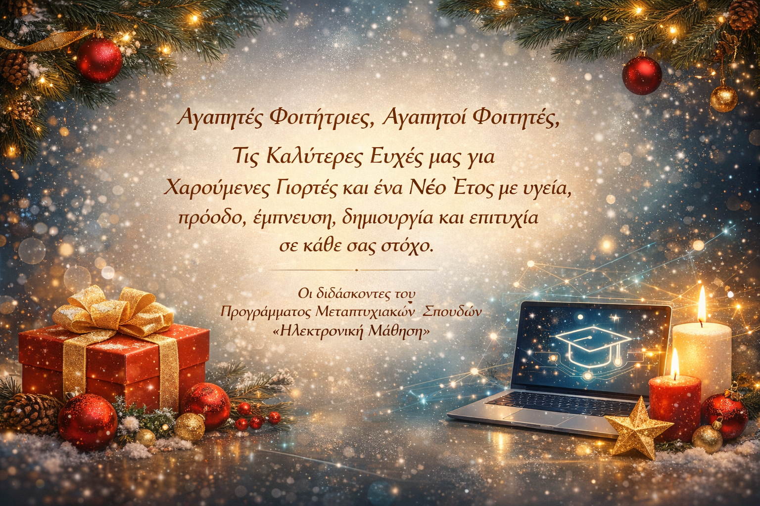 Θερμά συγχαρητήρια για την ολοκλήρωση των μαθημάτων του πρώτου εξαμήνου του Μεταπτυχιακού Προγράμματος. Η προσπάθεια, η επιμονή και η δέσμευση που δείξατε σε αυτή την απαιτητική αλλά και δημιουργική διαδρομή αξίζουν ειλικρινή αναγνώριση. Γνωρίζουμε ότι οι μεταπτυχιακές σπουδές απαιτούν οργάνωση, αυτοπειθαρχία και διαρκή ενεργή συμμετοχή, συχνά παράλληλα με επαγγελματικές και προσωπικές υποχρεώσεις. Το γεγονός ότι […]